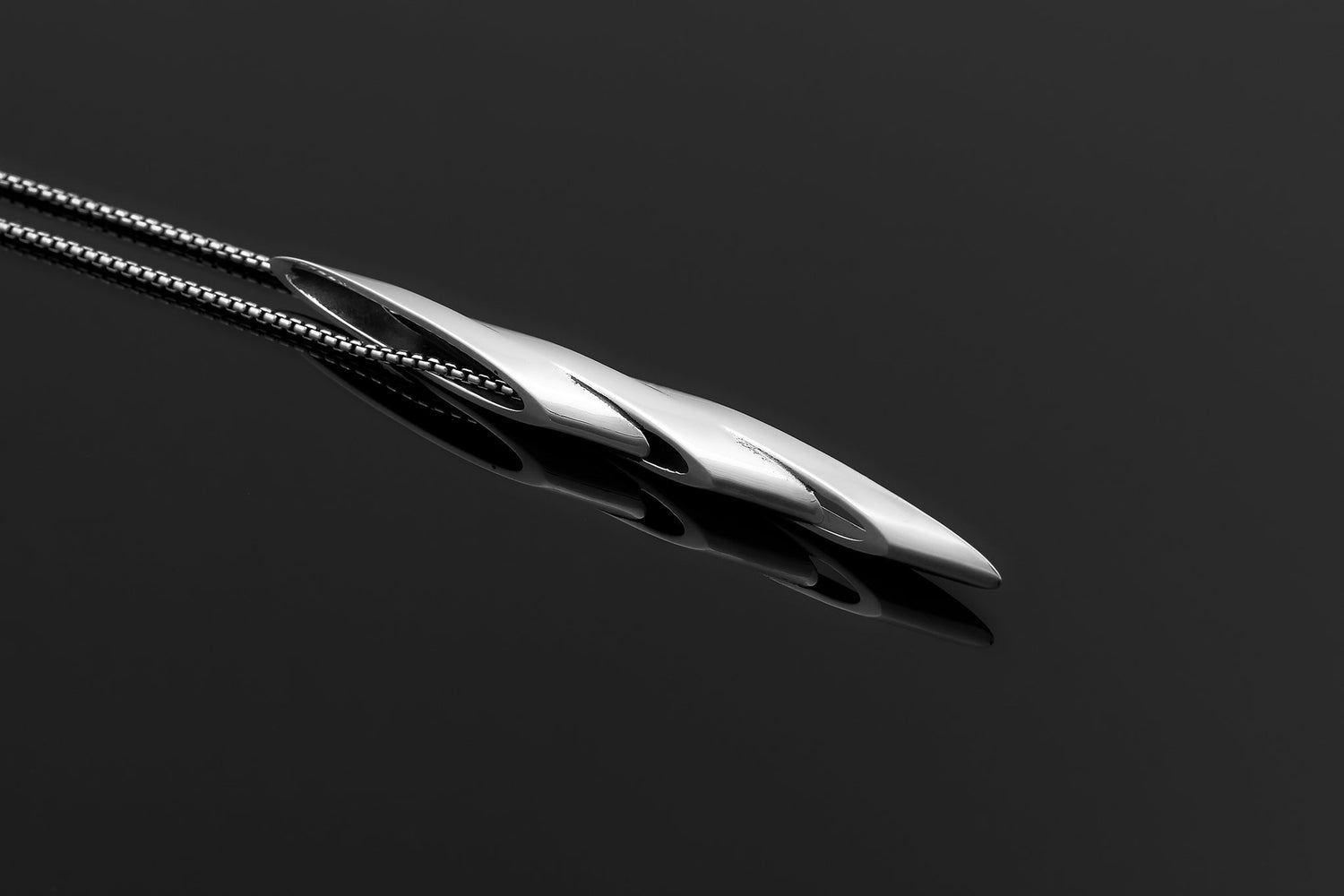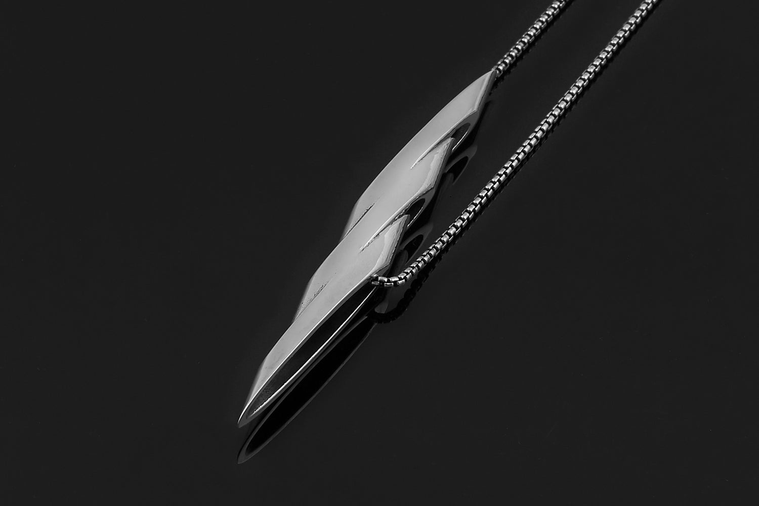 Pendant dimensions are 92 x 12 x 7.5mm made from 14 grams of sterling silver on a 30” 1.8mm round box chain with lobster closure.