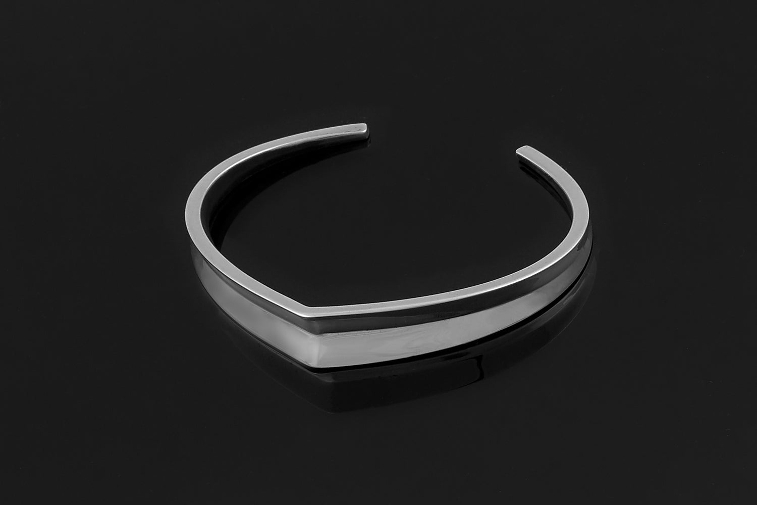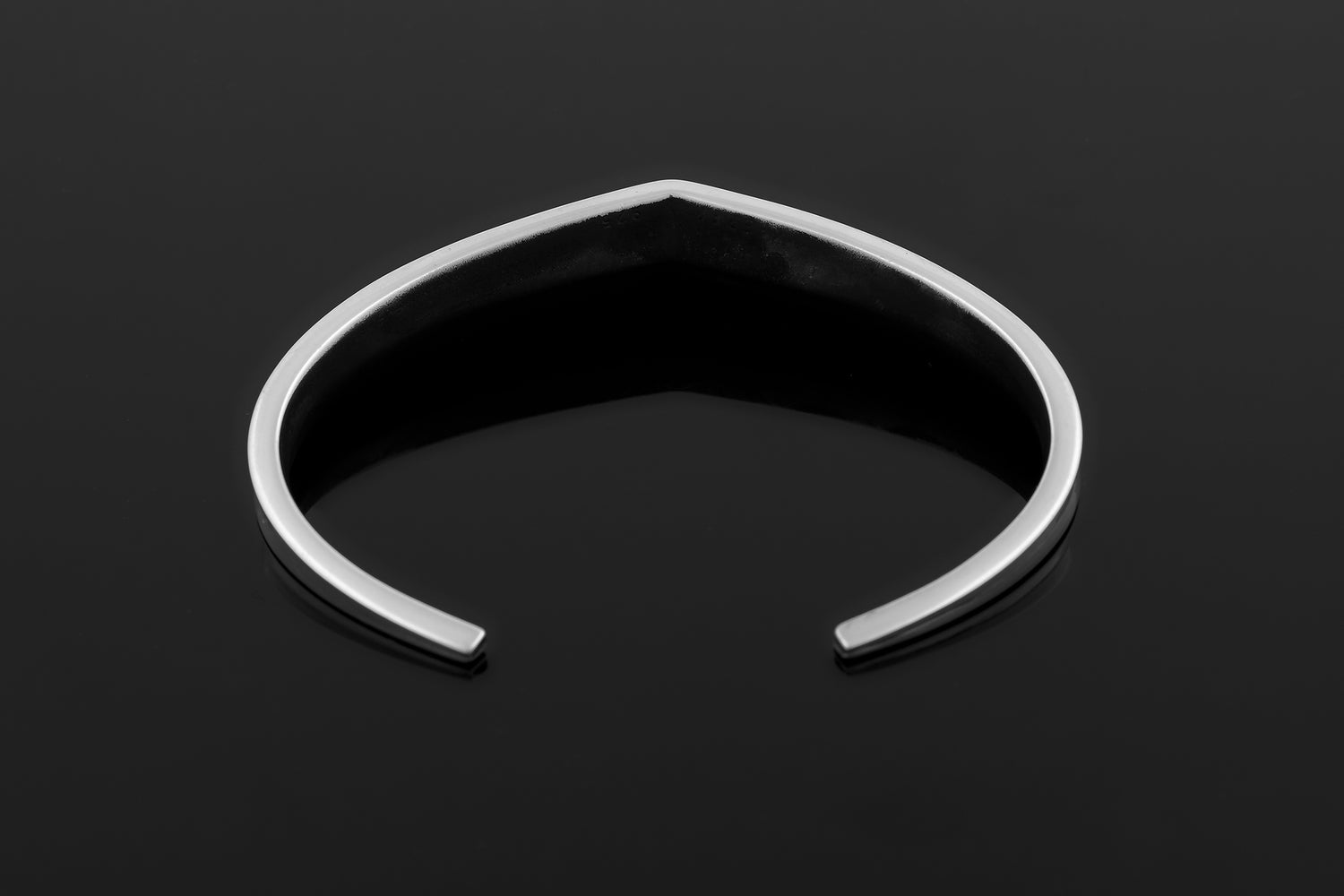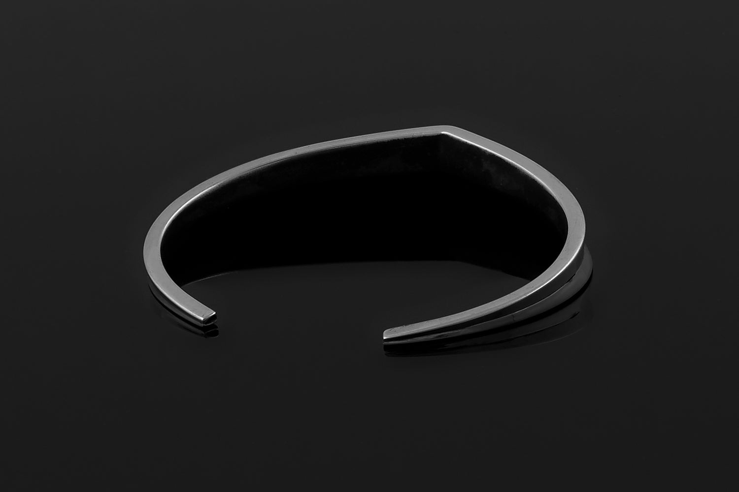 Fabricated from .925 silver, this unisex design is locally crafted in equal parts by machine and hand. Uniquely painted oxidation over satin finish.