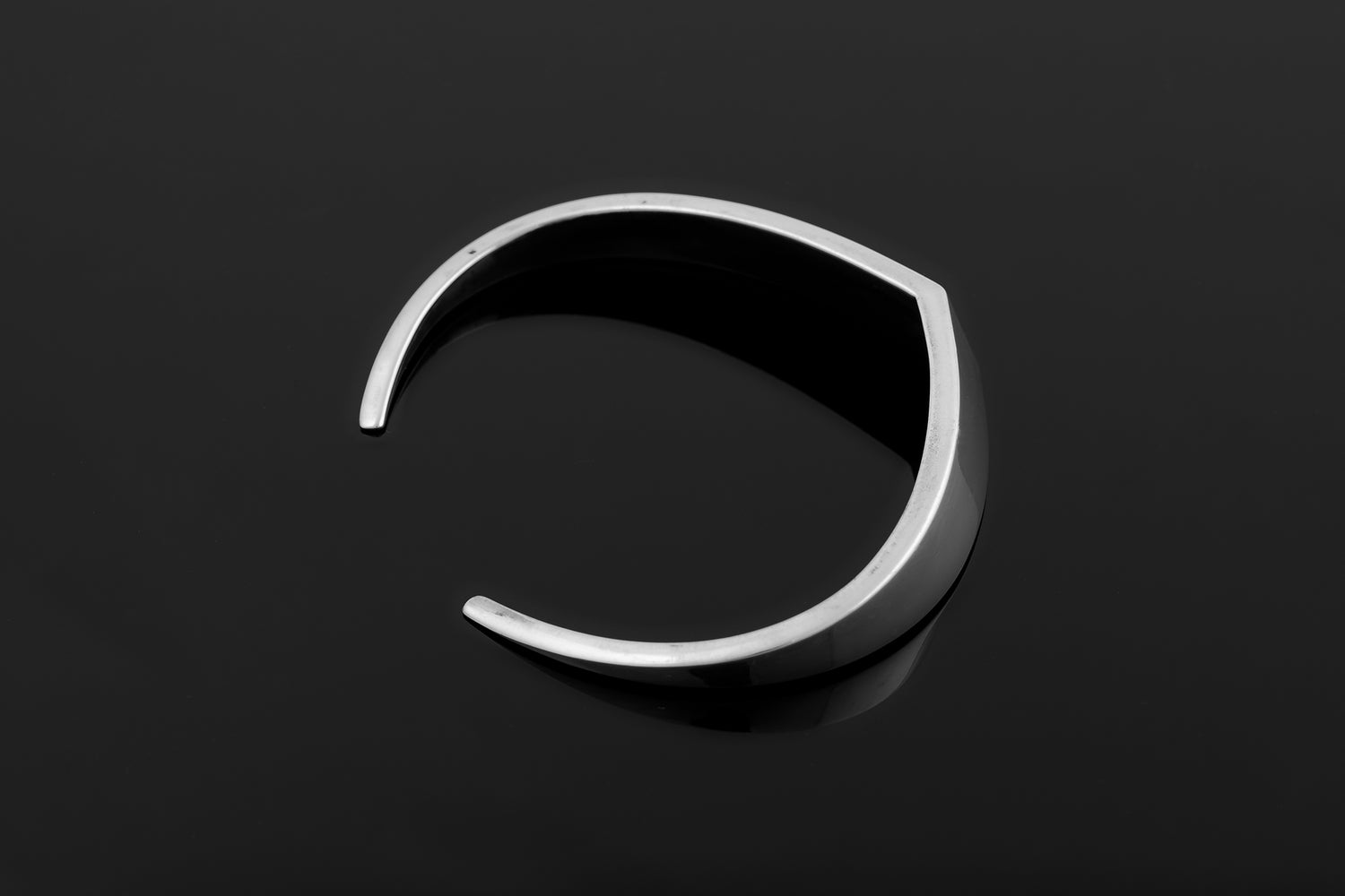 Bangle dimensions are 66 x 55 x 10mm made from 33 grams of sterling silver. Available in sizes Small: 55mm, Medium: 60mm, Large: 65mm