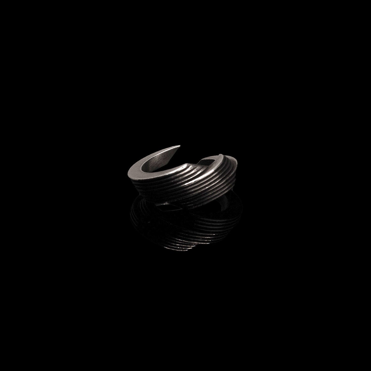 Ring width is 10mm with a band thickness of 4mm. It is made from 8 grams of sterling silver. Adjustable opening for flexible sizing.